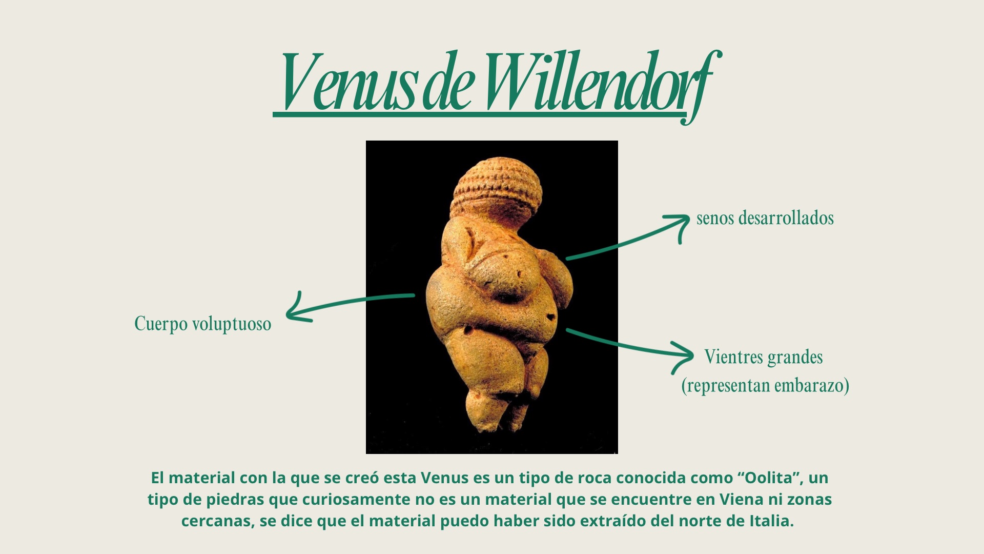 Algunos estudios sobre este arte apuntan a funciones “ totemicas“ identificación de las tribus o de contacto espiritual con algún animal protector o guía. La llegada de las glaciaciones en este periodo, provoco que el evolucionado Homo Sapiens-Sapiens tuviera que refugiarse en cavernas. A partir de este momento, se dice, comenzarían las primeras producciones de estatuillas como “ La venus de Willendorf“. Descubierta en 1908 en Willendorf, Austria. Las venus son pequeñas estatuillas que reflejan la idea de fertilidad, eran mujeres voluptuosas, con senos desarrollados y gran abdomen, dando a entender que estaban embarazadas. Todo esto, con la idea y propuesta de difundir la fertilidad entre las mujeres de la población.